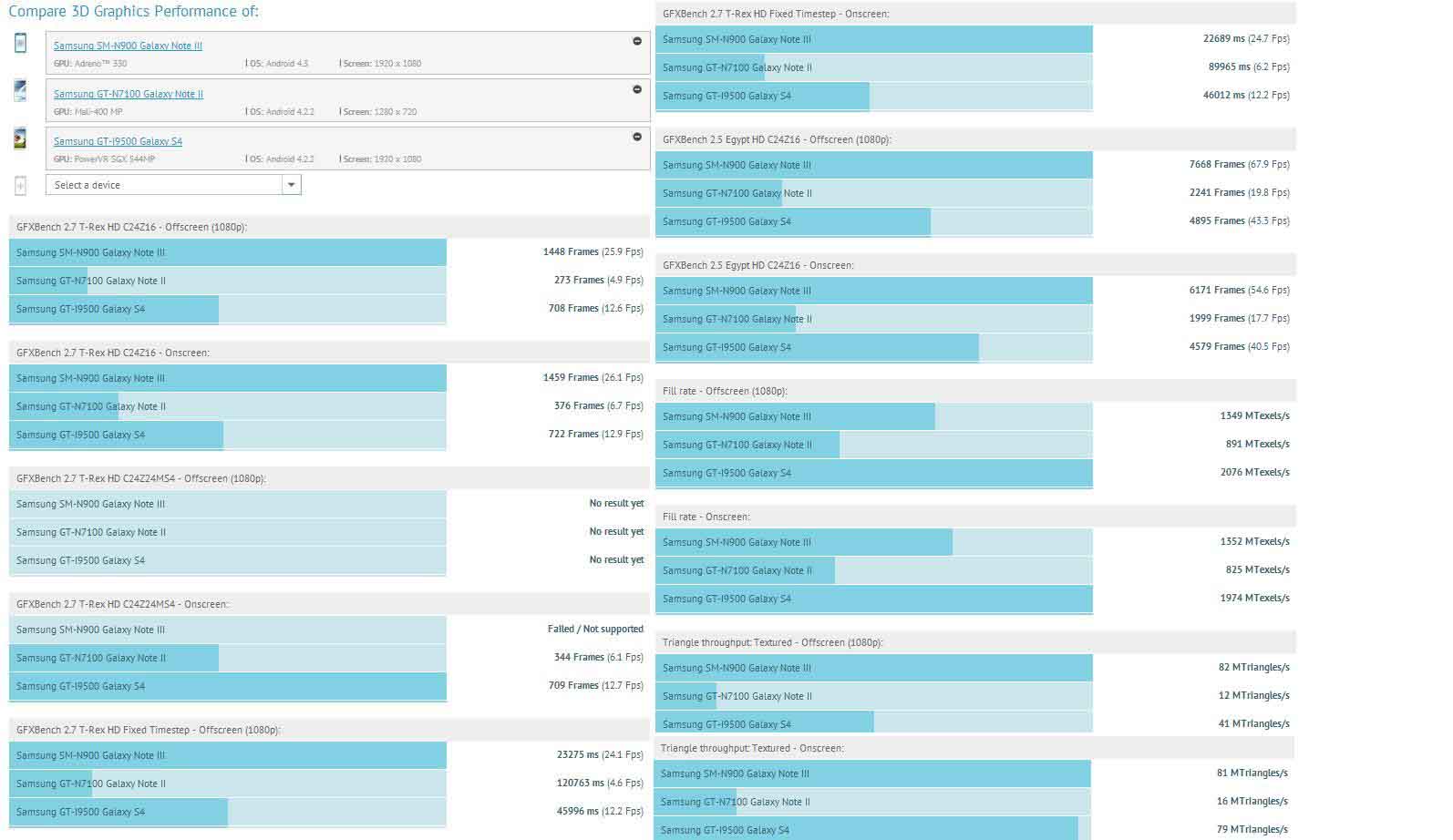 Hasil benchmark tersebut juga menampilkan bagaimana performa keunggulan antara Galaxy Note 3 dengan saudara terdekatnya, Samsung Galaxy S4. Dalam gambar tersebut terlihat bahwa performa keduanya jelas-jelas mengungguli Galaxy Note 2 versi sebelumnya. Lihat pada gambar di bawah ini.